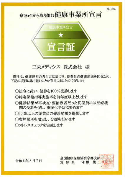 三栄メディシス株式会社は、全国健康保険協会京都支部に京(きょう)から取り組む健康事業所宣言を行っています。